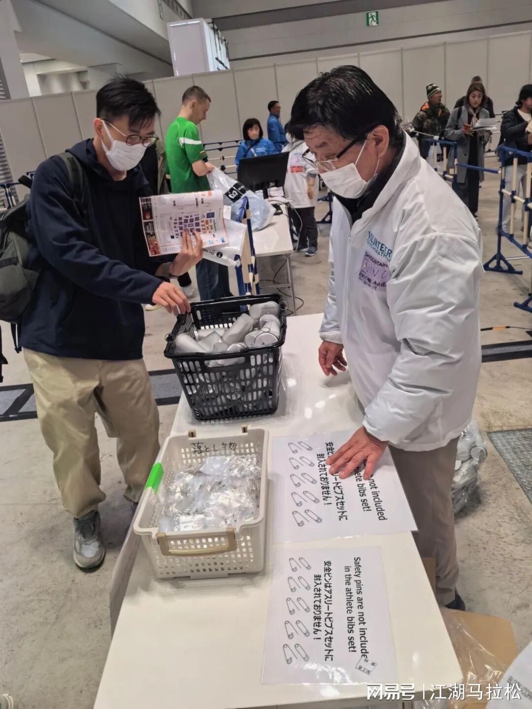 对于东京马来说,就没有参赛包一说了。你报名时缴费购买了服装等,可以到专门的柜台取领取。接下来验芯片,过了后有软杯子、别针可以自取,就这些了。
