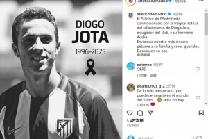 马竞官方社媒写道:“马德里竞技俱乐部对前球员迪奥戈-若塔及其兄弟安德烈的不幸去世深感震惊,我们向其家人及亲友致以最诚挚的慰问。愿他们安息。”